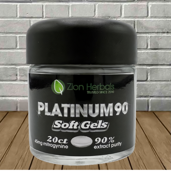 Zion Herbals Platinum90 90% Kratom Extract Soft Gels come in a 20-ct resealable jar. Each high-potency soft gel contains 50mg total alkaloids, 45mg mitragynine, and .15mg 7-hydroxymitragynine from a 90% kratom extract.