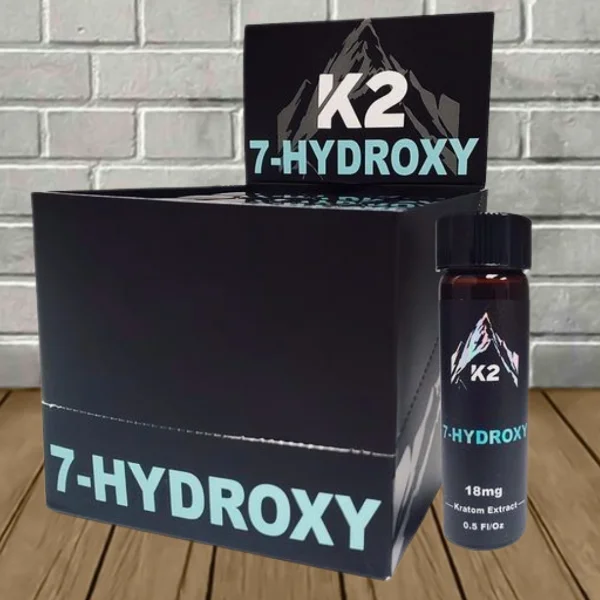 K2 7-Hydroxy Liquid Kratom Extract Shots come in a resealable 0.5-fl oz glass bottle. Each bottle contains 18mg of a highly concentrated, high-purity 7-hydroxymitragynine extract with small amounts of mitragynine and other alkaloids for a full-spectrum experience. These bottles were formulated to be consumed in two servings, each providing a moderate dose of 9mg 7OH.