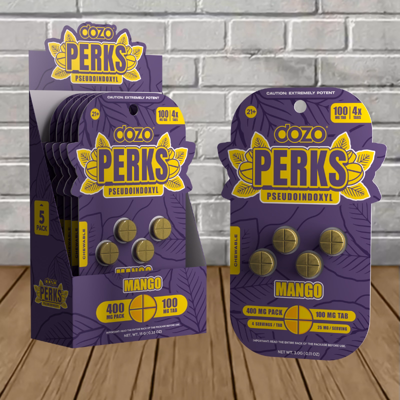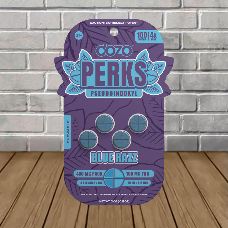 The Dozo Perks Pseudoindoxyl Tablets 4ct line comes in standout flavors and two packaging options. You can choose a 4ct Single Blister Pack or a Bulk Case Deal that includes 10 packs for a total of 40 tablets.