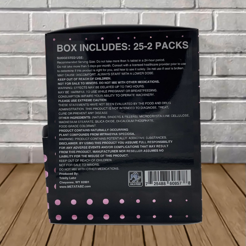 Each pack includes 2 chewable tablets containing 100mg of 7-Hydroxy goodness. You can grab a single 2ct pack to test the waters, or go big with the 25-pack bulk case in assorted flavors. MetaTabz delivers quality in every flavor, so pick what sounds good and get after it.