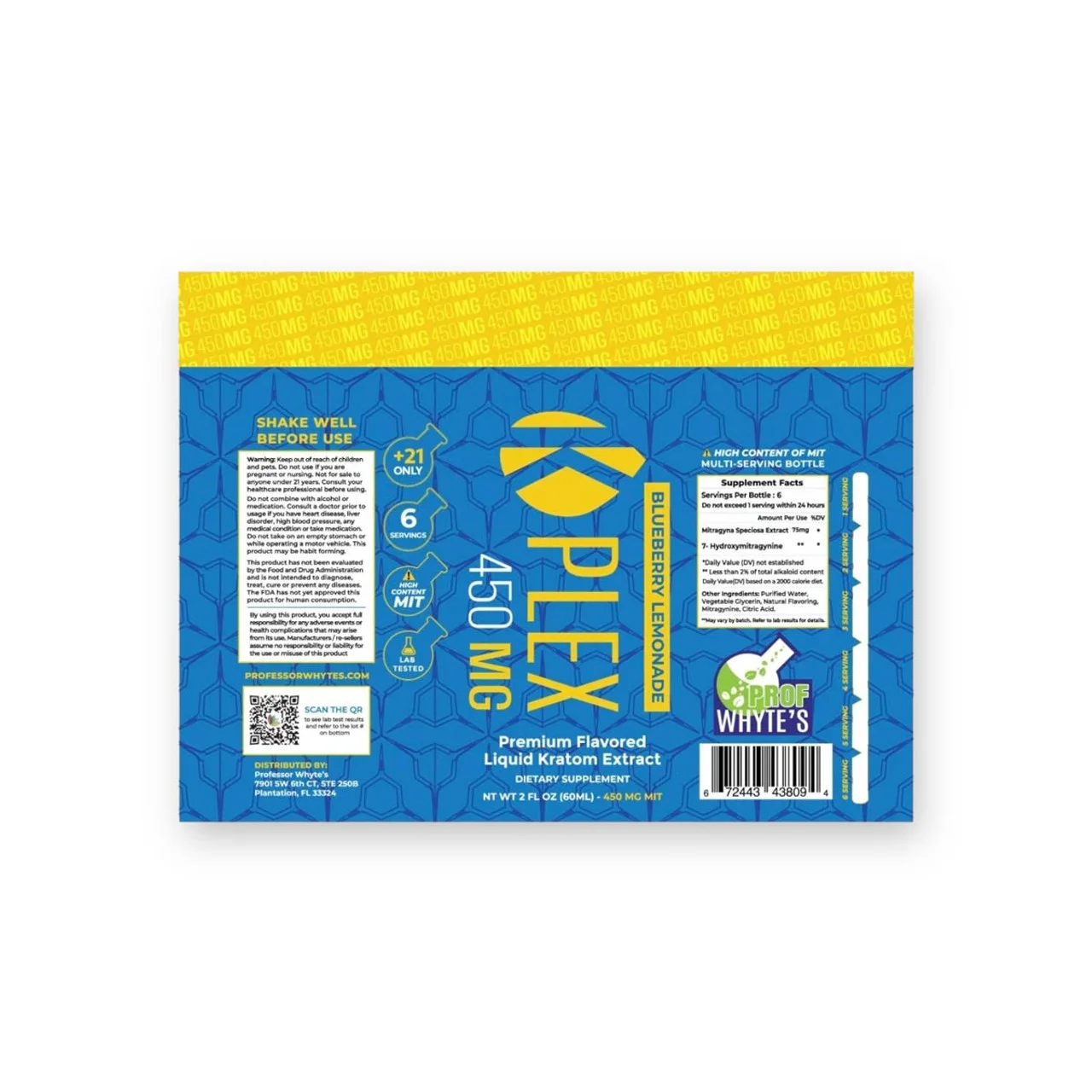 Prof Whytes K-Plex Liquid Kratom Extract Shot comes in a 2fl oz glass bottle. Every bottle includes 60ml of tasty blueberry lemonade-flavored liquid. This 60ml of flavor-packed goodness provides six servings of high-quality kratom extract, each containing a precise dose of 75mg mitragynine. That brings these new high-potency kratom extract shots to a total of 450mg of Mitragynine per bottle.