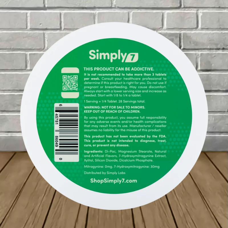 Simply7 7-OH Extract Tablets come in a securely sealed pocket-sized can. Every can contains seven perfectly pressed kratom extract tablets scored down the center for easy and convenient dosing.